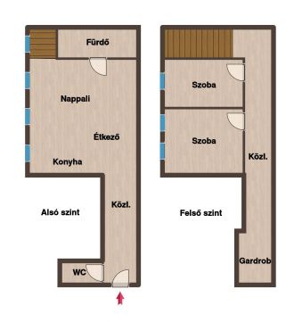 Kényelmes lépcsőn jutunk fel az emeletre, ahol két, 11 illetve 14 nm-es szoba és egy gardrób rész található!