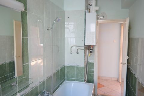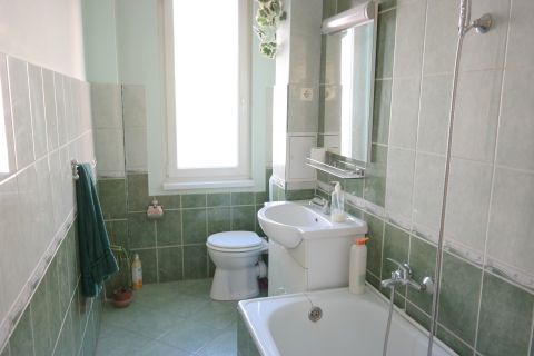helyiség járólappal burkolt. Az ablakos fürdő kifogástalan állapotú, a nagyobbik szobát