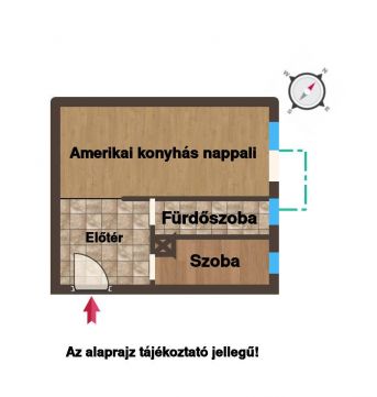 Praktikus elrendezés: előtér, hálószoba, amerikai konyhás nappali, tágas fürdőszoba. A nappalihoz egy 2 m²-es erkély tartozik, ideális a reggeli kávéhoz.