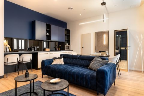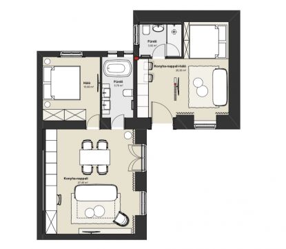 Az egyik lakás amerikai konyha nappali,külön hálószobás, nagy fürdőszobás, összesen 43 nm-es.