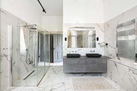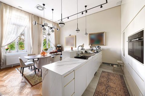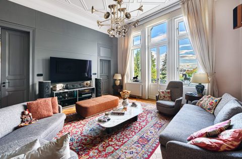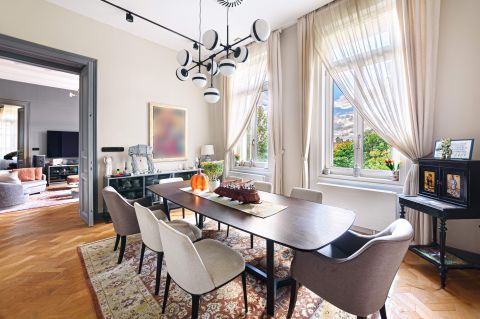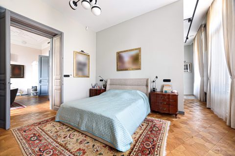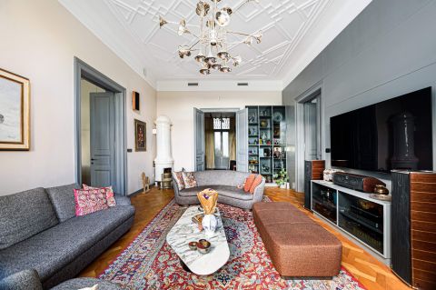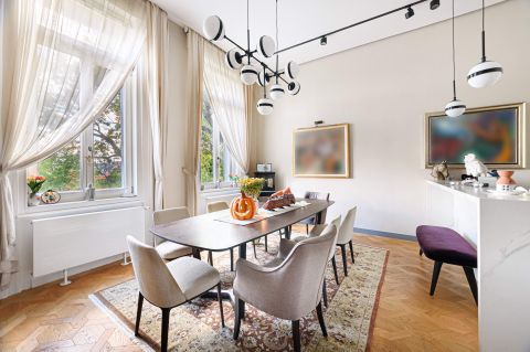 This 214 m² extravagant villa home was born from the elegant merger of two upper-middle-class apartments, which is the perfect choice for a family in every respect. It is located on the first floor of an imposing villa building and impresses its visitors from the first moment with its spacious spaces, 4-meter ceiling height and use of premium materials.