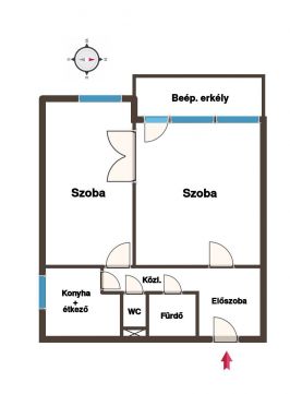 Az lakás elosztása kiváló, áll két szobából, egy előszobából, közlekedőből, külön fürdőből és WC-ből, valamint egy étkezős konyhából, amely ablakkal is felszerelt. A fűtésről és a meleg víz ellátásról egyedileg mért távhő gondoskodik, hűteni klímával lehet. A külső nyílászárók többrétegű, műanyag ablakok.