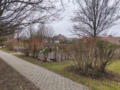 A társasház kulturált, rendezett, az udvaron játszótér található. A környék kifejezetten nyugodt, zöldövezeti, ideális választás azok számára, akik csendes, mégis jól megközelíthető környezetben szeretnének élni.
