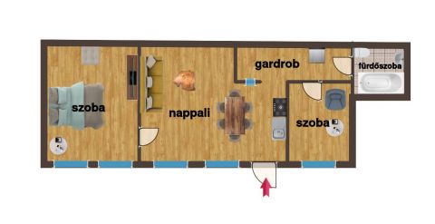 Amerikai konyhás nappali + külön nyíló hálószoba + félszoba