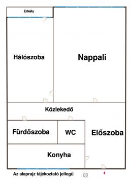 Elrendezése: Nagy nappali, hálószoba (melyből a kb. 3 nm-es erkély is nyílik), konyha, mely ablakkal rendelkezik a belső udvarra, továbbá fürdő, külön WC és közlekedő.