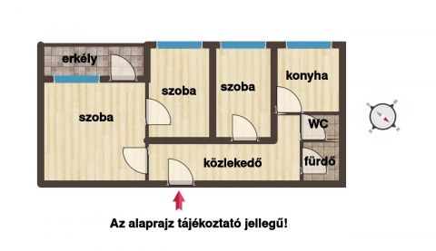 Elrendezése praktikus, az előszoból nyílt minden helyiség, de egy kis átalakításnak köszönhetően jelenleg az egyik fél szoba a nappaliból nyílik. A konyha gépesített, a vételár részét képezi.