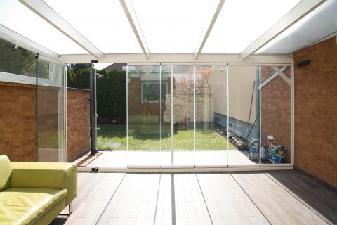 A nappaliból egy 22 m²-es, elhúzható üvegfalakkal zárható terasz nyílik, ami közvetlen kapcsolatban van a kb. 80 m²-es saját kerttel ez az egyik legerősebb része az ingatlannak, tényleg jól használható tér egész évben.