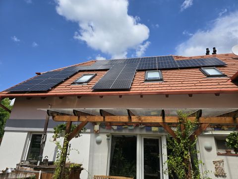 A tetőn elhelyezett 8,5 kWp-es napelem rendszer a lakás teljes elektromos energiaigényét fedezi, sőt évi kb. 5000 kWh többlettermelést biztosít.