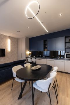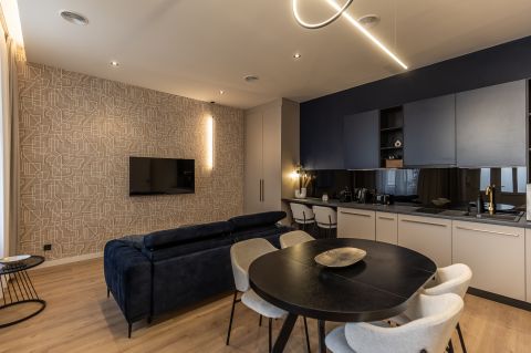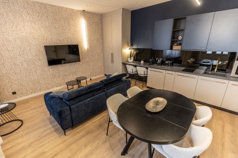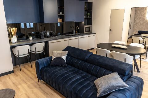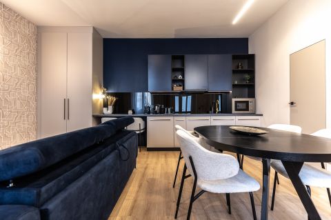 Az egyik lakás amerikai konyha nappali,külön hálószobás, nagy fürdőszobás, összesen 43 nm-es.