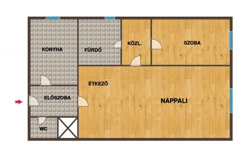 Jelenlegi hasznos lakrész nagy méretű nappali-étkezőből, külön bejáratú szobából, előszobából, konyhából, közlekedőből, fürdőből és külön álló wc-ből adódik össze.