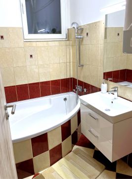A kényelemről a fürdőszobában elhelyezett sarokkád gondoskodik, mely mellett még a mosógép is elfér.