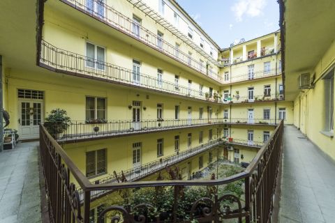 A tágas, napfényes amerikai konyhás nappaliból csendes, belső utcára néző erkélyre léphetünk egy tökéletes hely egy reggeli kávéra vagy esti borozásra.