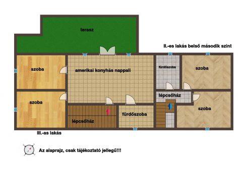 Elosztását tekintve: előszoba, közlekedő, 2 fürdő, lépcső, amerikai konyhás nappali. 3 szoba,