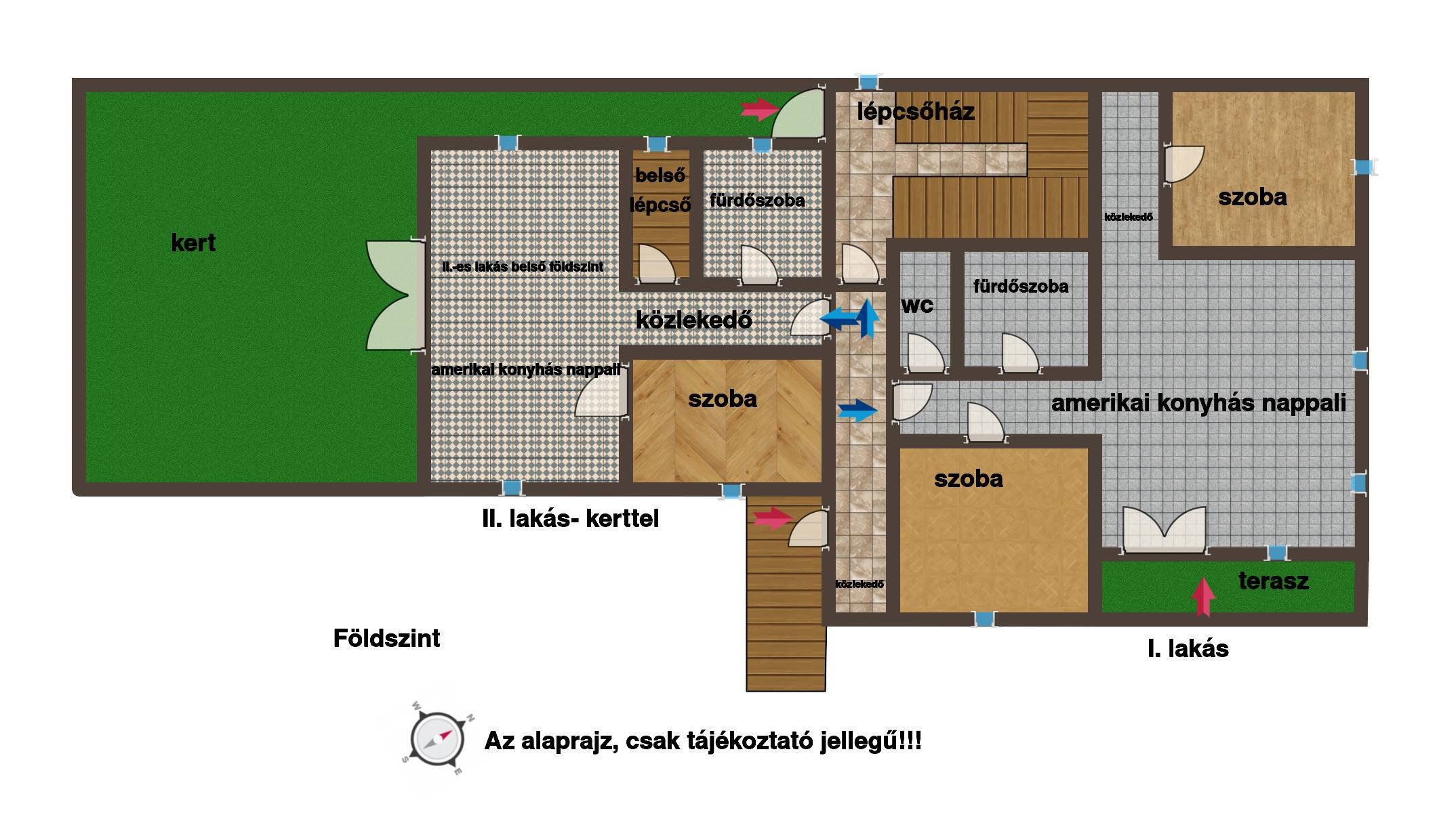 Elosztását tekintve: előszoba, wc, közlekedő, fürdő, 2 szoba, amerikai konyhás nappali, terasz