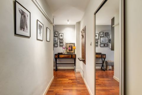 The apartment is on an added upper level, offering modern living standards while retaining the elegant character of the classic building.