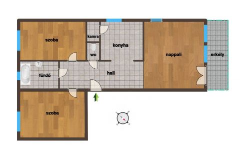 71 m²-es, első emeleti, nappali + 2 szobás.