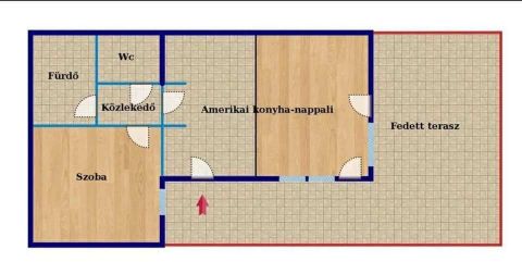 A lakás elrendezése amerikai konyhás nappali + 1 hálószoba, fürdőszoba, külön WC, valamint egy fedett terasz és saját, intim kertrész.