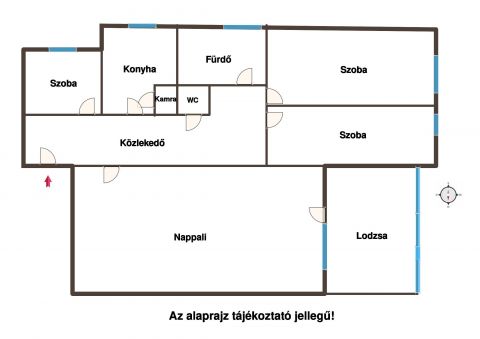Elosztását tekintve: 3 szoba, nappali, fürdő és WC külön helyiségekben, konyha + kamra, közlekedő, lodzsa.