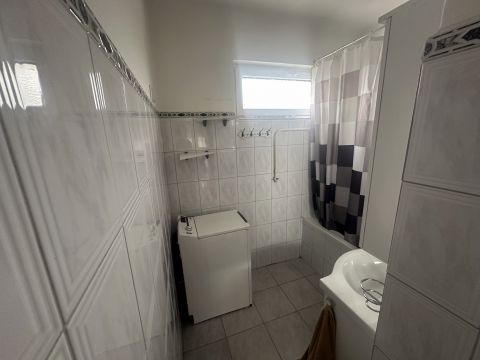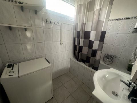 -A lakás tartozéka mosógép, hűtőszekrény, konyha asztal, szék, konyha bútor.