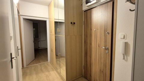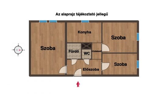 Az elrendezés praktikus: amint belépünk, egy tágas előszobába jutunk, ahol nagy méretű beépített szekrények várnak. Innen balra a legnagyobb szobába lépünk, amely mérete miatt tökéletes nappaliként is funkcionálhat. Az előszobától jobbra egy közlekedő vezet a további 2 szobához és a modern konyhához.