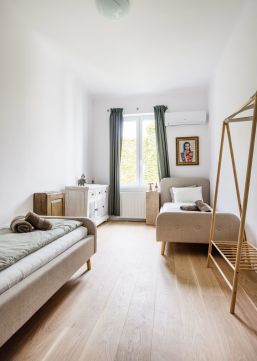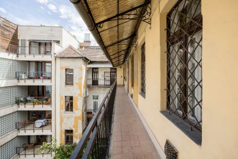 Az épület körfolyosós kialakításának köszönhetően a lakás teljesen csendes, minden ablaka a belső udvarra néz, így a belvárosi elhelyezkedés ellenére nyugodt otthont kínál.