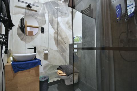 - újszerű fürdőszoba, modern burkolatokkal