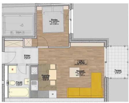 Élhető terek: Minden lakáshoz tartozik egy tágas, 5nm- 30 nm közötti terasz.