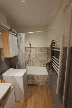 A fürdő és a WC egy helyiségben található, a belső nyílászárók cseréje megtörtént, és az ingatlan meleg burkolatokkal fedett.