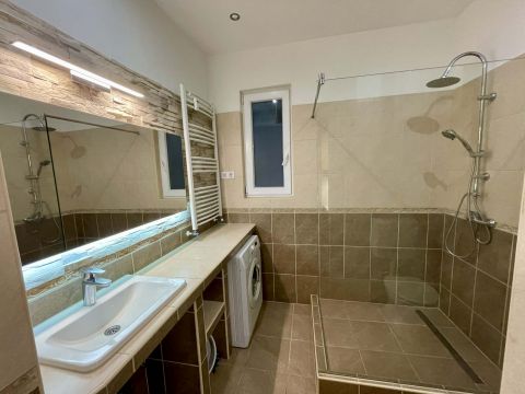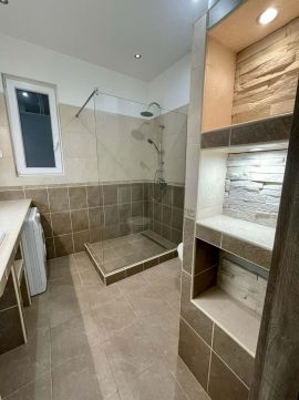 Tágas, zuhanyzós fürdőszoba: