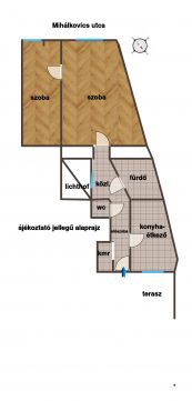 53 négyzetméter, magas földszinti, utcai nézetű - kivéve a konyha-, és egy belső udvarról nyílik a lakás, így kedves kis teraszt lehet kialakítani a lakás előtt.