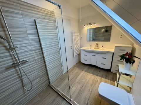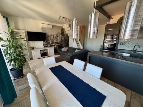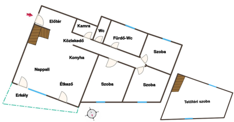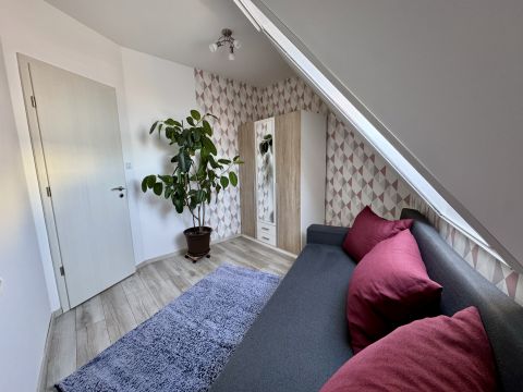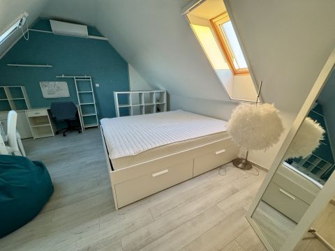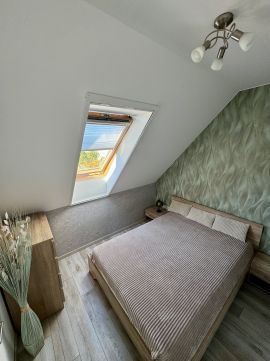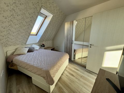 A világos, napfényes élettér, a gondosan kialakított helyiségek és a nagy méretű beépített tárolók a mindennapok kényelmét szolgálják. A nappali és a tetőtéri szoba klimatizált, utóbbiban hűtő-fűtő klíma és infrapanel biztosítja az egész éves komfortot.