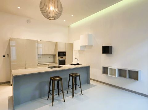 A lakásban egyedi tervezésű, teljesen gépesített konyhabútor került beépítésre.
