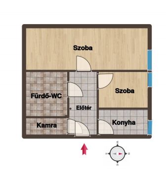 A lakás praktikus elosztású: az előtérből minden helyiség külön megközelíthető. A szobák jól bútorozhatók, a konyha mellett kamra biztosít extra tárolási lehetőséget. A fürdőszoba és a WC egy légtérben található.
