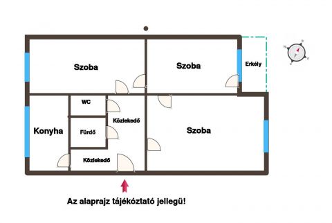 Belépés után az előszobában találjuk magunkat, ahonnan jobbra a nappali helyezkedik el, balra a konyha, szemben pedig egy szoba található. Itt találhatjuk a mosdót és a fürdőt is. a nappaliból nyíló szobában található egy csendes, zöld területre néző loggia.