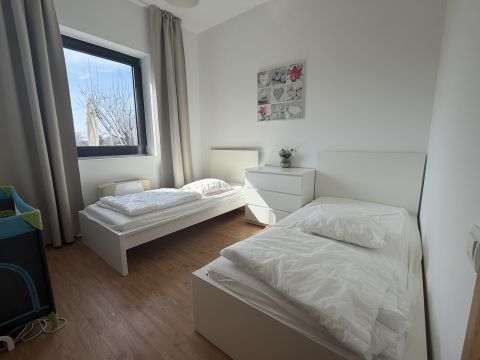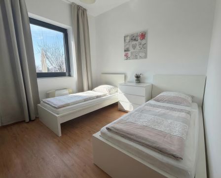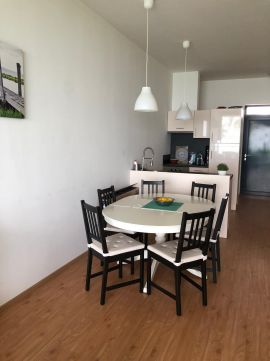 A belső elrendezés praktikus és élhető: a világos nappali közvetlen kijárattal rendelkezik a teraszra és a kertbe, míg a két külön nyíló hálószoba nyugodt, intim életteret biztosít. A nagy üvegfelületeknek köszönhetően a lakás egész nap világos, a balatoni panoráma pedig a mindennapok természetes része.
