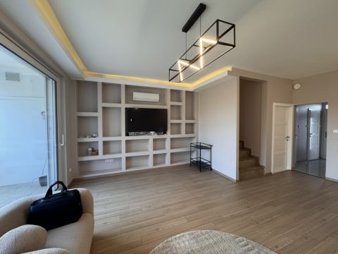 * Exkluzív berendezés: A tágas nappaliban található OLED TV és a teljes bútorzat szintén az ajánlat része.