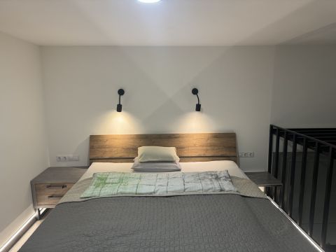 A hálószoba a galérián kapott helyet, amely 9 m²-es, 210 cm-es belmagassággal rendelkezik, és egy „king-” méretű franciaágy biztosítja a kényelmet. A nappali tágas, 20 m²-es, ahol egy kihúzható kanapé (időszakosan két személy számára alkalmas), egy nagy, háromrészes tolóajtós szekrény, valamint egy nagy méretű, tanulásra és home office-ra is alkalmas étkezőasztal található. Emellett egy 40”-os LED TV, két vezetékes internetcsatlakozási lehetőség és több helyről kapcsolható mennyezeti, illetve LED világítás is a nappali része. Az ablakok „black-out” sötétítő függönnyel vannak felszerelve.