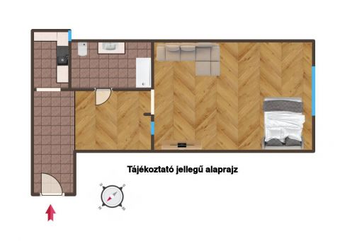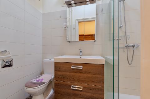 A kompakt, modern konyhafülke és a beépített zuhanyzós fürdő praktikus mindennapi használatot ad.
