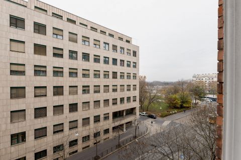 Magas emeleti elhelyezkedésének köszönhetően napfényes, az ablakból jobbra a Parlament, balra a Margit-sziget látható.