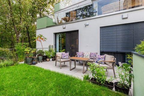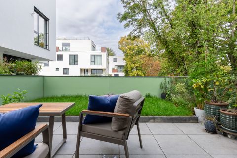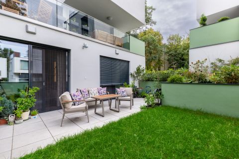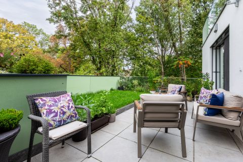 A 22 nm-es gránitburkolatú terasz, a 12,5 nm-es privát, füvesített kert, valamint a növénykazettás magas ágyás exkluzív természetközeli atmoszférát teremt.