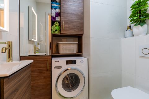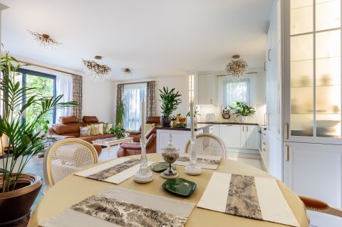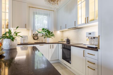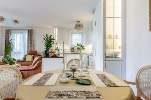 Az egyedi tervezésű konyhabútor masszív kőpulttal, beépített prémium készülékekkel (Gaggenau, Bosch, Liebherr) és szigeten elhelyezett borhűtővel rendelkezik. A funkcionalitás és az esztétikum tökéletes harmóniáját a Villeroy&Boch mosogató, valamint az arannyal futtatott DornBracht csaptelep teszi teljessé.