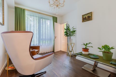 Az ingatlanban kettő darab master bedroom található , de az egyik szoba jelenleg egy intim tárgyaló és relaxációs tér. Az itáliai mestermunkák egyik ékköveként szolgáló, eredeti bőr kárpitozású relaxfotelek tökéletes kényelmet biztosítanak. A történelmi eleganciát egy Mária Terézia-stílusú kristálycsillár koronázza meg, a térből pedig közvetlen kilátás nyílik a nyugodt, zöldellő kiserdős területre, amely teljes intimitást garantál.
