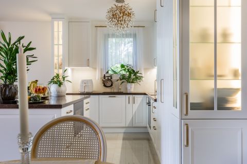 A konyha stílusához illeszkedő, mégis egyedi gyártású vitrinkombináció elegáns módon rejti el a TV-t, hogy a tér minden egyes eleme a kifinomult design szolgálatába álljon