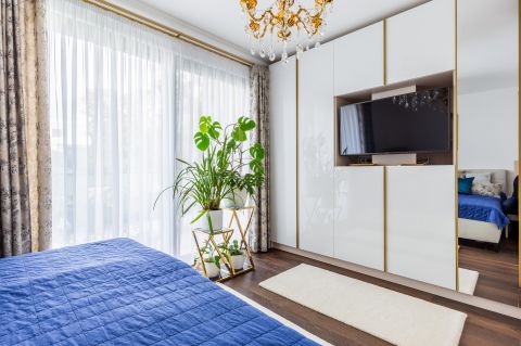 Az eredeti bőrrel kárpitozott, ágyneműtartós ágy az elegancia és a praktikum tökéletes egysége. A teljes falat beborító, egyedi tervezésű beépített szekrénysor maximális tárolókapacitást és időtálló stílust biztosít.