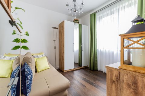 A kisebb szoba vendégszobaként funkcionál, eredeti bőr kanapéággyal. Ez az egyetlen helyiség, amely a közös kertre néz, biztosítva ezzel a friss levegő és a természet közelségének élményét.