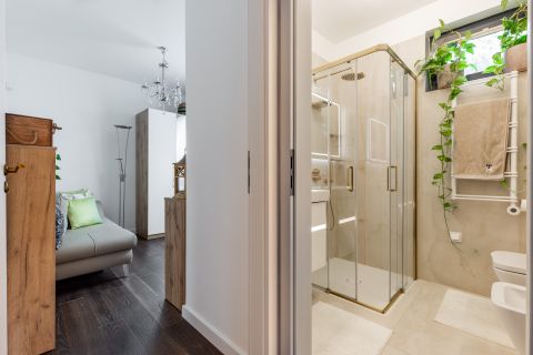 A második fürdőszoba sem marad el az exkluzivitásban: Villeroy&Boch szaniterek, 13 karátos aranyozott DornBracht csaptelepek, valamint egy épített wellness-zuhanykabin. A háromállású zuhanyrendszer (fejzuhany, kézizuhany, nyak-zuhatag) és a Hüppe aranyozott üvegkabin minden használatkor a luxus és a kényeztetés érzését nyújtja.