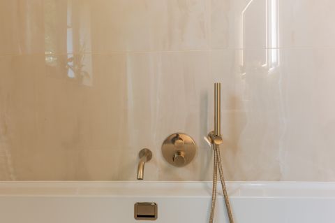 A fürdőszoba exkluzivitása vitathatatlan: a legmagasabb minőségű Villeroy&Boch szaniterek, többek között WC-bidé, kádszett és mosdó biztosítják a kifinomult eleganciát. Az enteriőr esszenciáját a 13 karátos arannyal futtatott DornBracht csaptelepek adják, amelyeket az igényes luxus kedvelői azonnal felismernek, és értékelnek.