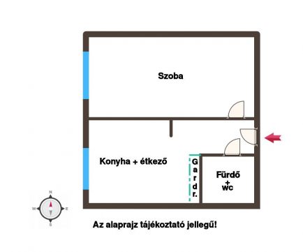 - 1 szoba + étkező-konyhás