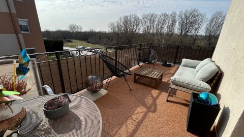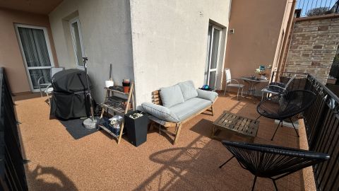 A 21 m²-es terasz nemrég teljes felújítást kapott: új szigetelést és Epoxy műgyanta burkolatot, így esztétikus és időtálló kültéri felületet biztosít.