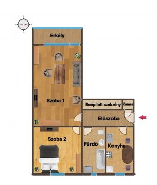 A lakás bútorozatlan, a konyhabútor és a villanytűzhely az ár része. Előszoba beépített szekrénnyel és kamrával, fürdőkádas fürdőszoba WC-vel, valamint erkély is tartozik hozzá. Az épületben közös tároló áll rendelkezésre.